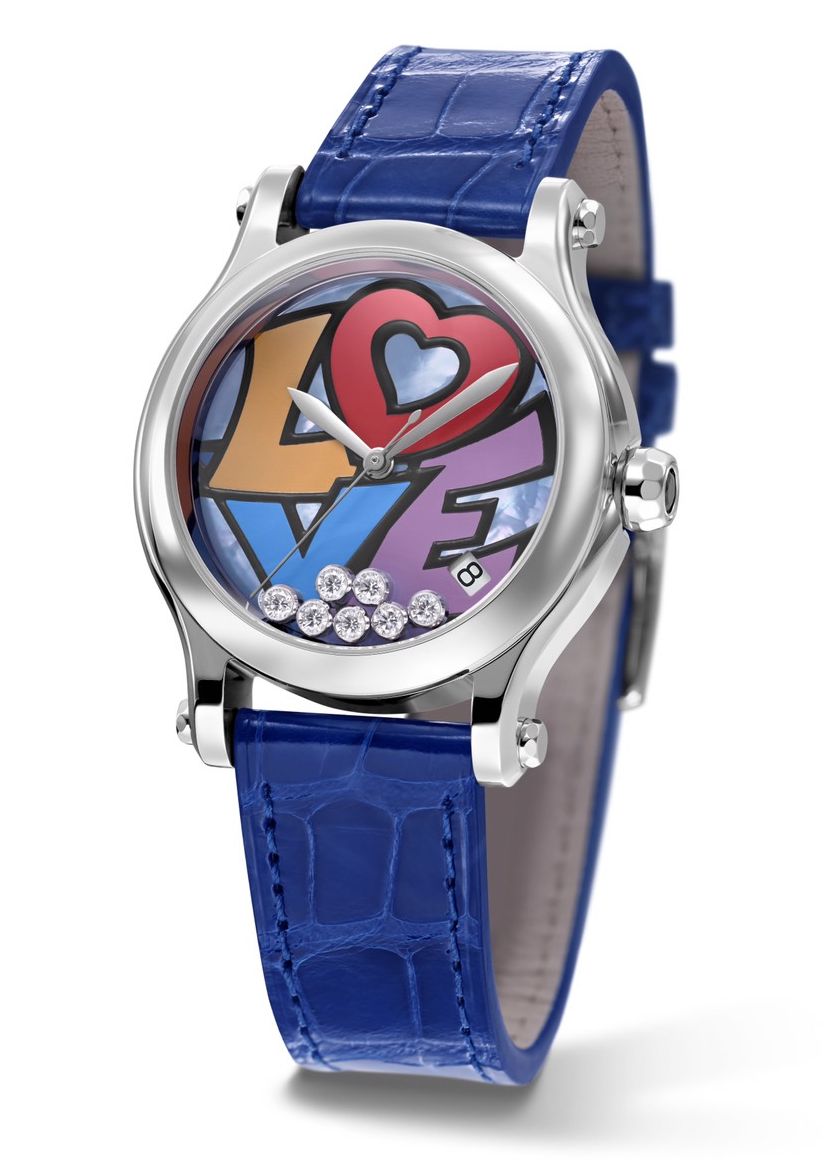 Happy Love 系列腕錶,限量發行250只,滑動鑽石在印有「LOVE」塗鴉字母的藍色珍珠母貝錶盤上再次綺麗旋舞。